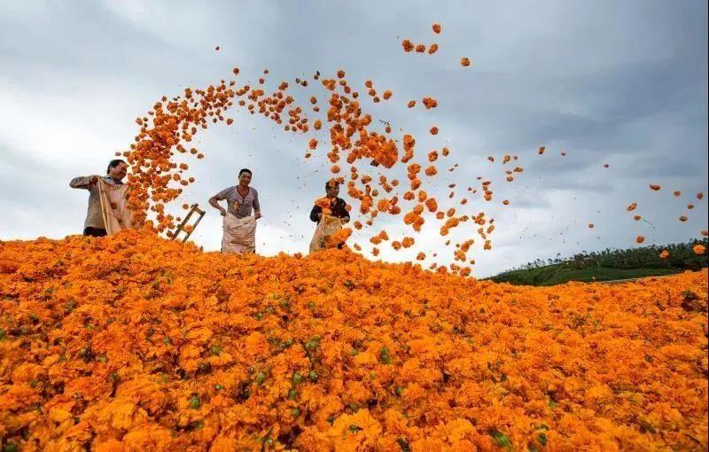(万寿菊大丰收场景,丘北县扶贫办供图)